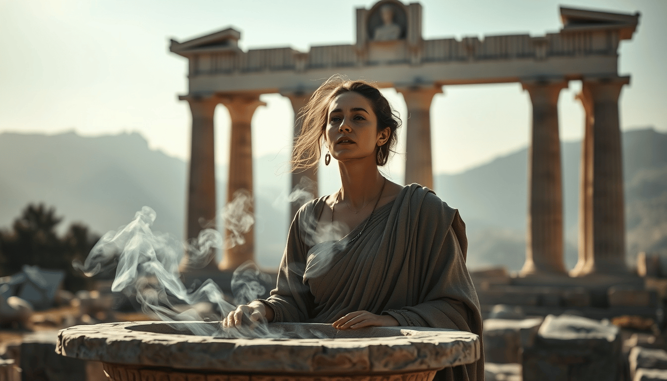 Im Herzen des Orakels von Delphi wirkte die Pythia, eine auserwählte Priesterin, die mit göttlicher Weisheit gesegnet sein sollte. Der Sage nach sprach sie unter der Einwirkung von Rauch und mystischen Gasen, die aus einer Erdspalte im Tempel aufstiegen. Ihre Weissagungen wurden von den höchsten Priestern des Tempels interpretiert und waren maßgeblich für politische und persönliche Entscheidungen im antiken Griechenland.